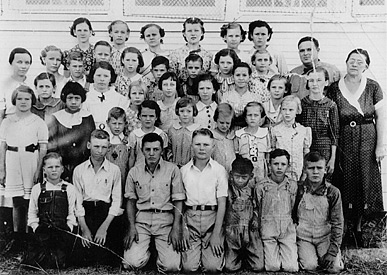 Fourth Row: Miss Josie Gibbs, Helen Stevens, Salamon boy, Douglas Houston, Elsie Helen Klapa, Delma Coley, Richard (Pedro) Dickey, Johnnie Fay Fuller, Aileen Fuller, Mr. Austin Childress