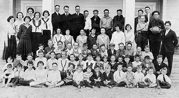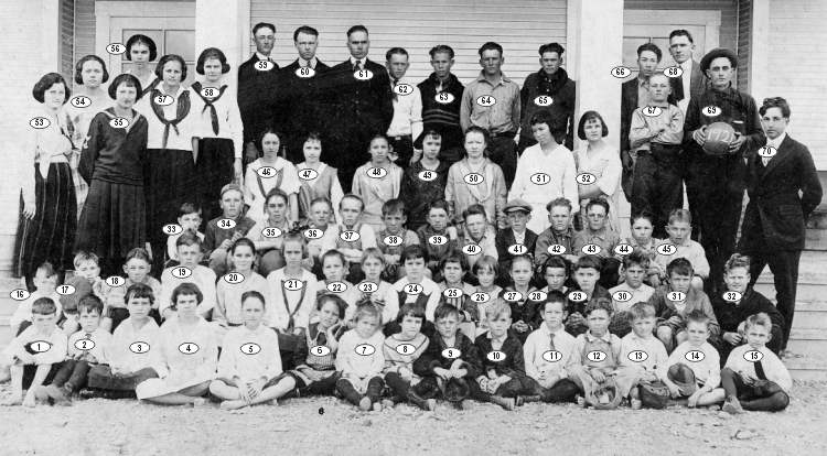 -- Row 5 [Top] --53 Christine Wallace (Teacher)54 May Houston 55 Vlasta Havlik 56 Kate Moorman 57 Esther Aikman 58 Bessie "Cottney" Richards 59 Clarence Colburn 60 Herman Gibbs 61 Marion Blaucett 62 Otis Fikes 63 Hubert Dobbs 64 Hardy Fikes 65 Thurman Donalson 66 Steve Mathews 67 Raymond Griswold 68 Mr. Baunds, Teacher 69 Dewey McCall 70 Hinton H. Prewitt |